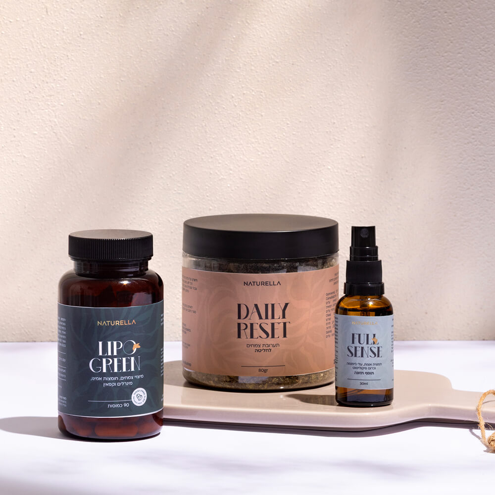 Lipo Green – קפסולה אחת בבוקר עם כוס מים Full Sense Spray – שתי התזות על הלשון לפני ארוחה או ברגעי קרייב Daily Reset Tea – שתי כוסות ביום, אחת בבוקר ואחת אחר הצהריים